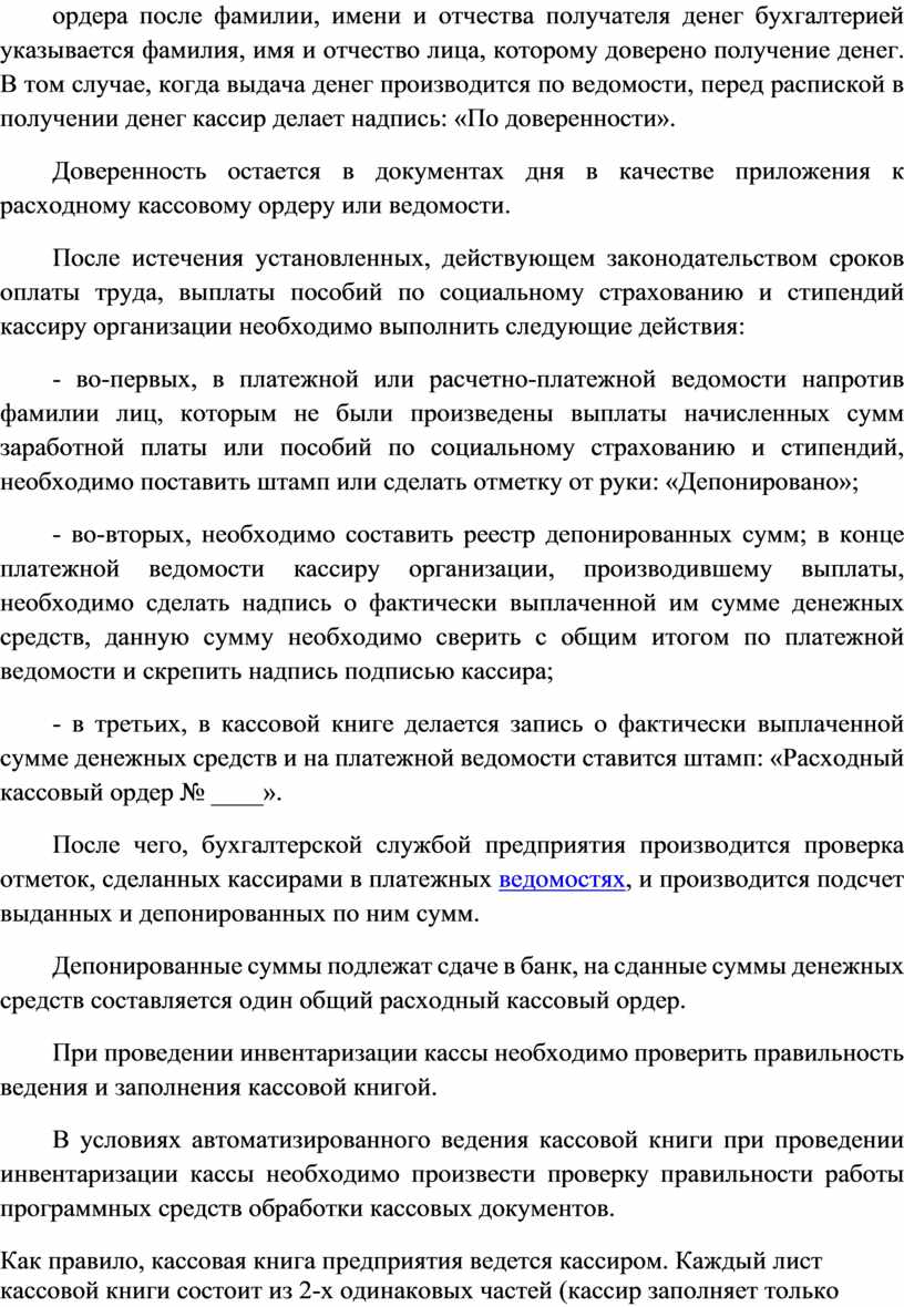 Выдача денежных средств кассиром предприятия может производится только лицу, указанному в расходном ордере или замещающем его документе. В том случае, если выдача денежных средств производится по доверенности, оформленной в установленном действующем законодательстве порядке, в тексте ордера после фамилии, имени и отчества получателя денег бухгалтерией указывается фамилия, имя и отчество лица, которому доверено получение денег. В том случае, когда выдача денег производится по ведомости, перед распиской в получении денег кассир делает надпись: «По доверенности».
