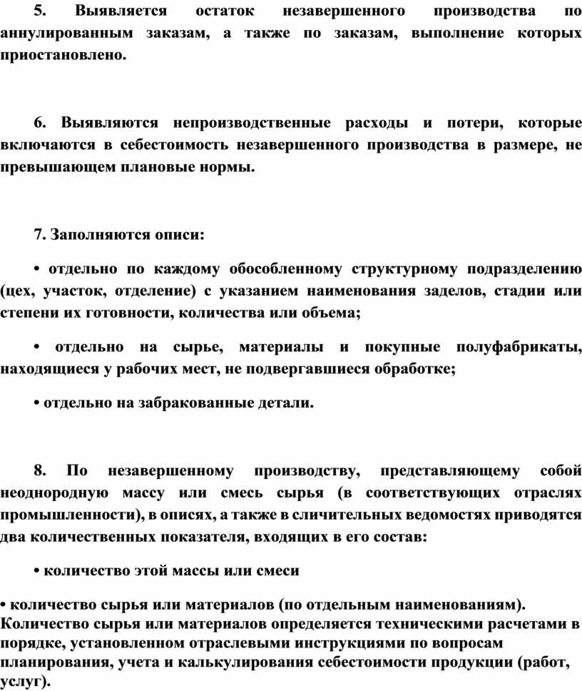 8. По незавершенному производству, представляющему собой неоднородную массу или смесь сырья (в соответствующих отраслях промышленности), в описях, а также в сличительных ведомостях приводятся два количественных показателя, входящих в его состав: