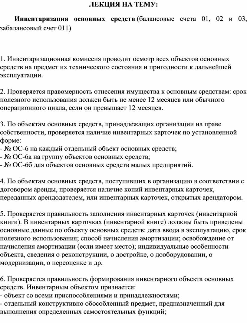 Инвентаризация основных средств (балансовые счета 01, 02 и 03, забалансовый счет 011)