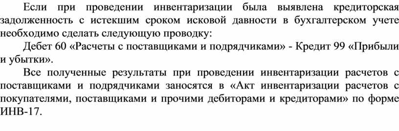 Если при проведении инвентаризации была выявлена кредиторская задолженность с истекшим сроком исковой давности в бухгалтерском учете необходимо сделать следующую проводку: