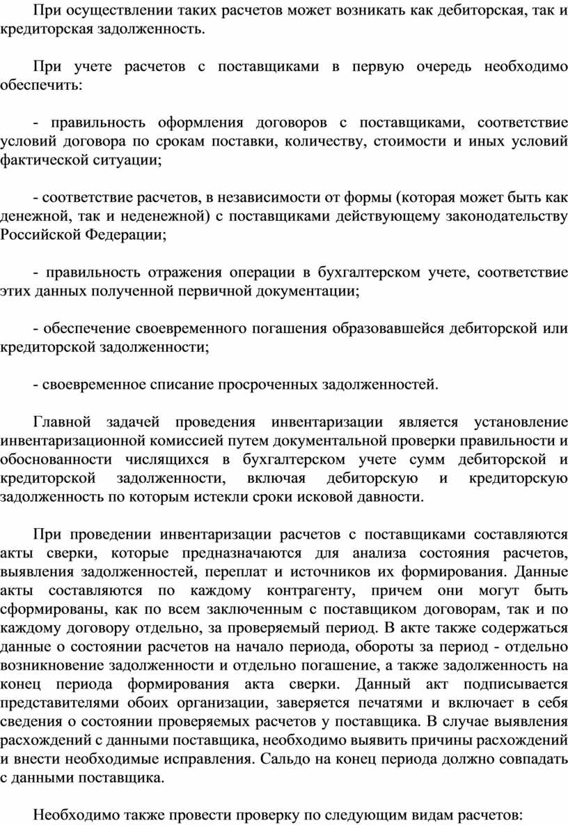 При проведении инвентаризации расчетов с поставщиками составляются акты сверки, которые предназначаются для анализа состояния расчетов, выявления задолженностей, переплат и источников их формирования. Данные акты составляются по каждому контрагенту, причем они могут быть сформированы, как по всем заключенным с поставщиком договорам, так и по каждому договору отдельно, за проверяемый период. В акте также содержаться данные о состоянии расчетов на начало периода, обороты за период - отдельно возникновение задолженности и отдельно погашение, а также задолженность на конец периода формирования акта сверки. Данный акт подписывается представителями обоих организации, заверяется печатями и включает в себя сведения о состоянии проверяемых расчетов у поставщика. В случае выявления расхождений с данными поставщика, необходимо выявить причины расхождений и внести необходимые исправления. Сальдо на конец периода должно совпадать с данными поставщика.