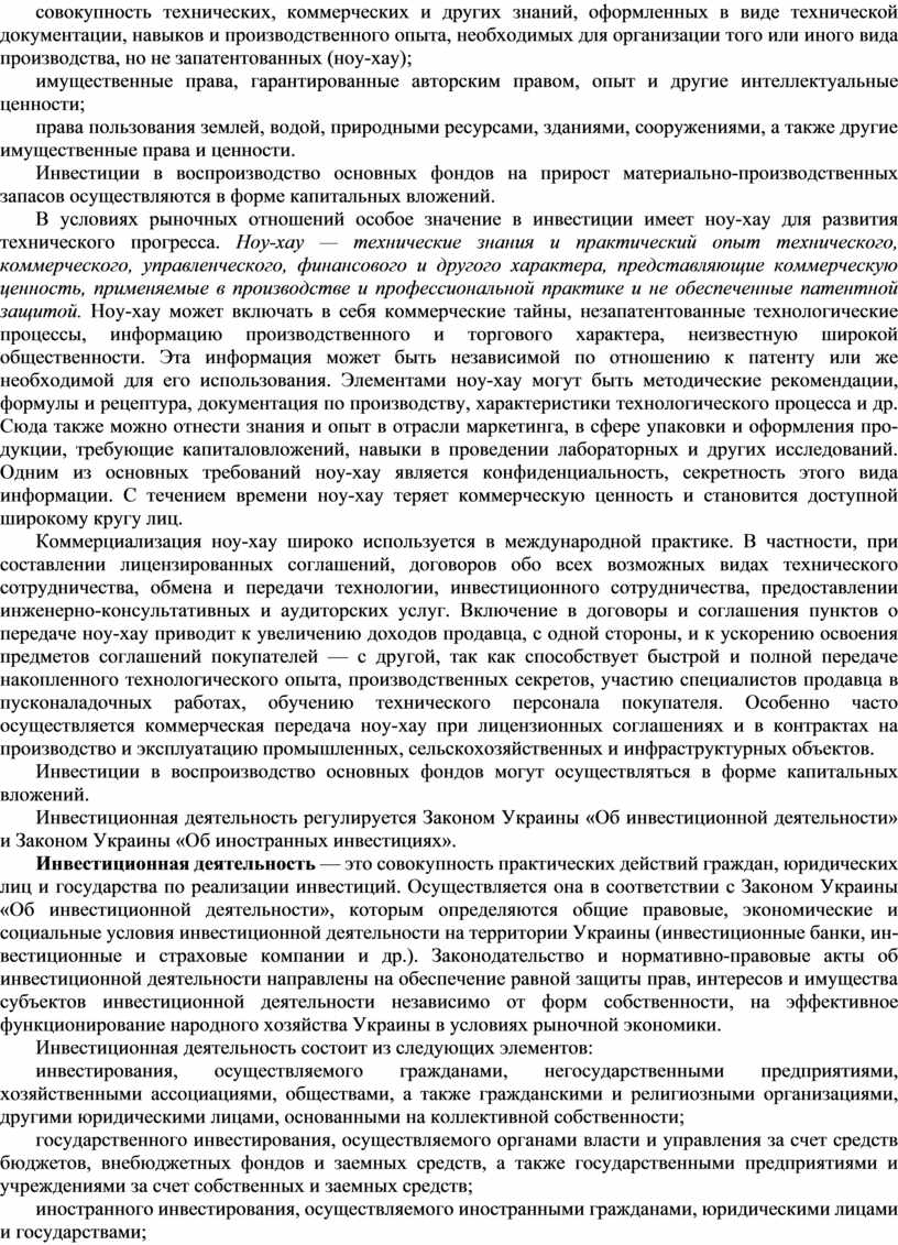 В условиях рыночных отношений особое значение в инвестиции имеет ноу-хау для развития технического прогресса. Ноу-хау — технические знания и практический опыт технического, коммерческого, управленческого, финансового и другого характера, представляющие коммерческую ценность, применяемые в производстве и профессиональной практике и не обеспеченные патентной защитой. Ноу-хау может включать в себя коммерческие тайны, незапатентованные технологические процессы, информацию производственного и торгового характера, неизвестную широкой общественности. Эта информация может быть независимой по отношению к патенту или же необходимой для его использования. Элементами ноу-хау могут быть методические рекомендации, формулы и рецептура, документация по производству, характеристики технологического процесса и др. Сюда также можно отнести знания и опыт в отрасли маркетинга, в сфере упаковки и оформления продукции, требующие капиталовложений, навыки в проведении лабораторных и других исследований. Одним из основных требований ноу-хау является конфиденциальность, секретность этого вида информации. С течением времени ноу-хау теряет коммерческую ценность и становится доступной широкому кругу лиц.