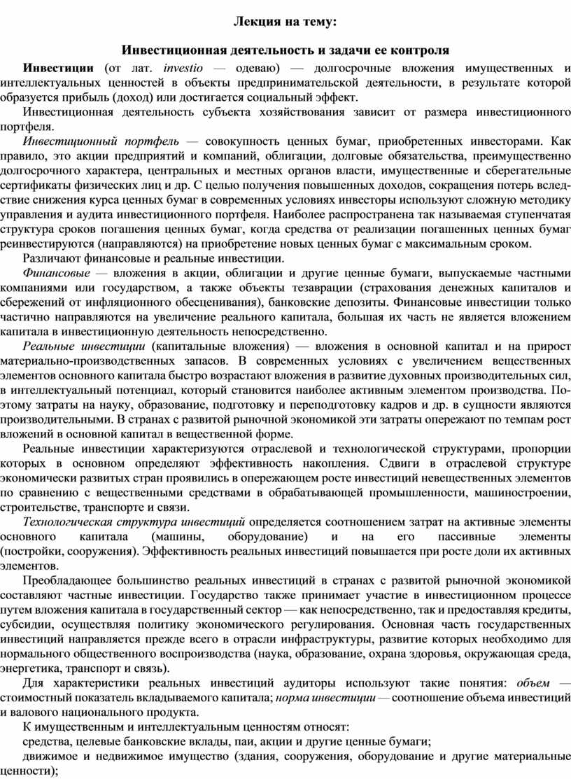 Для характеристики реальных инвестиций аудиторы используют такие понятия: объем — стоимостный показатель вкладываемого капитала; норма инвестиции — соотношение объема инвестиций и валового национального продукта.