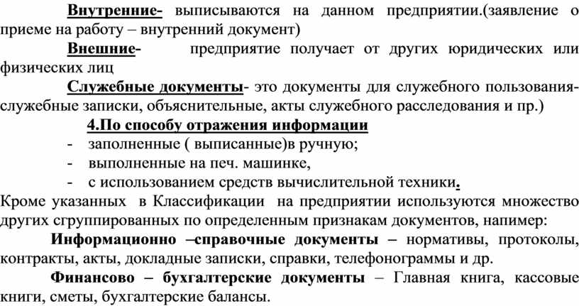 Внутренние- выписываются на данном предприятии.(заявление о приеме на работу – внутренний документ)
