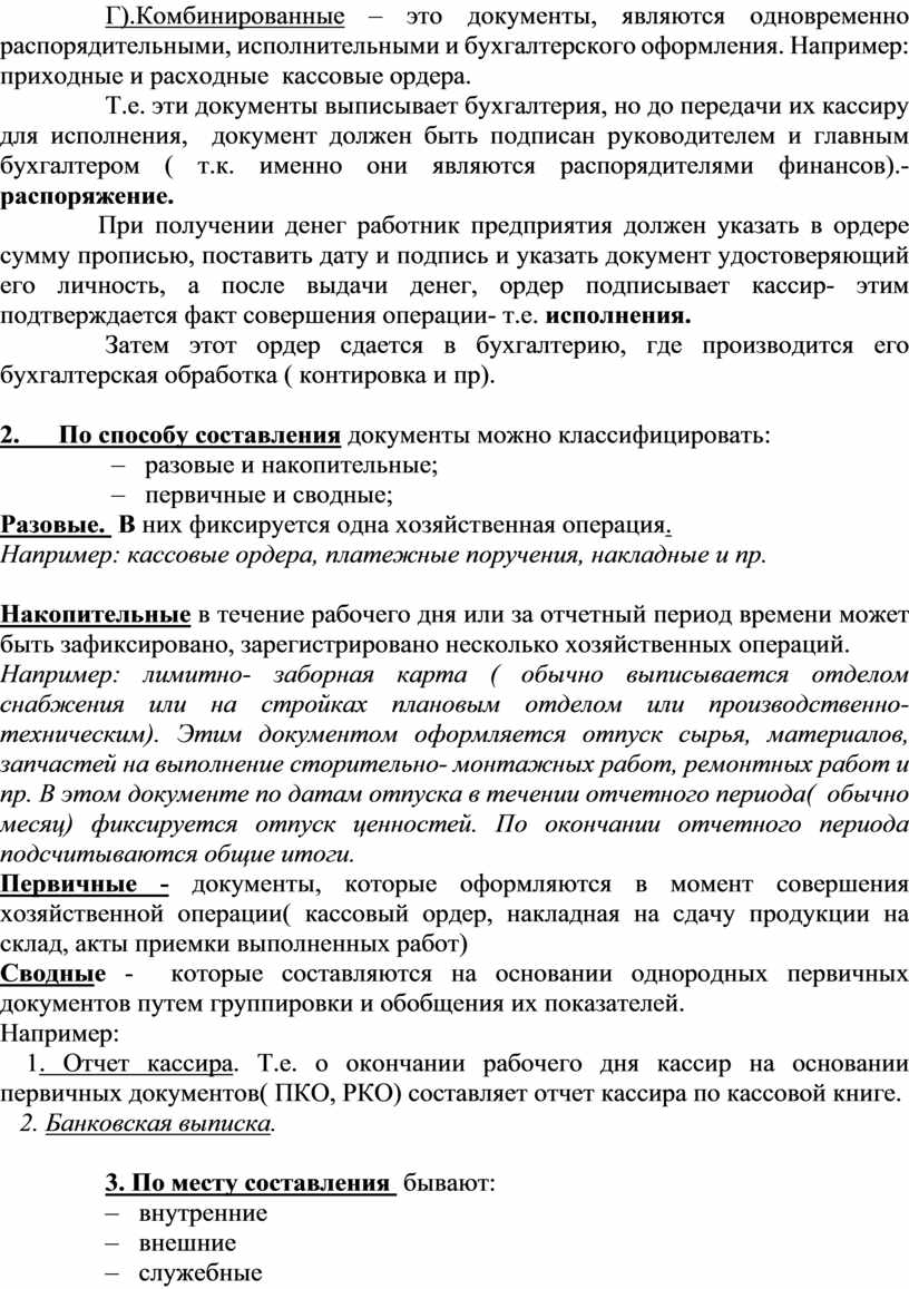 Г).Комбинированные – это документы, являются одновременно распорядительными, исполнительными и бухгалтерского оформления. Например: приходные и расходные кассовые ордера.