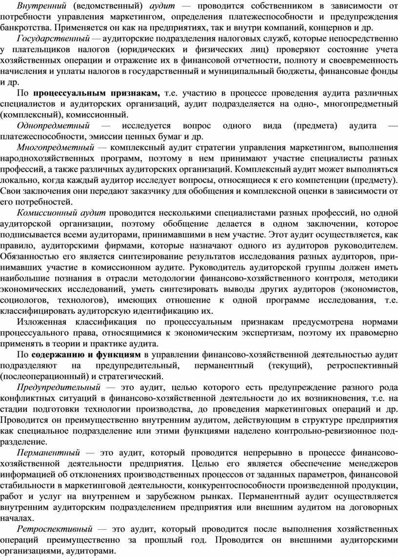 По процессуальным признакам, т.е. участию в процессе проведения аудита различных специалистов и аудиторских организаций, аудит подразделяется на одно-, многопредметный (комплексный), комиссионный.