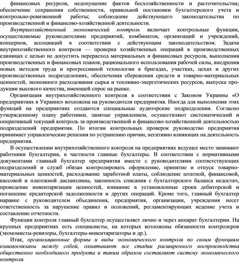 Итак, организационные формы и виды экономического контроля по своим функциям взаимосвязаны между собой, охватывают все стадии расширенного воспроизводства общественно необходимого продукта и таким образом составляют систему экономического контроля.