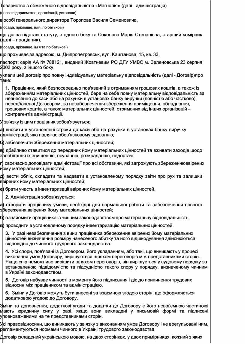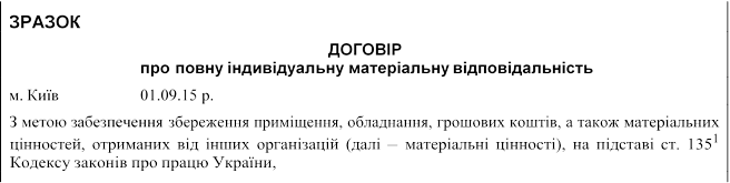 Договори про повну матеріальну відповідальність слід укладати на основі затверджених типових форм. Так, для індивідуальної матеріальної відповідальності така форма затверджена Постановою № 447 (див. зразок нижче), а для колективної – Наказом № 43.