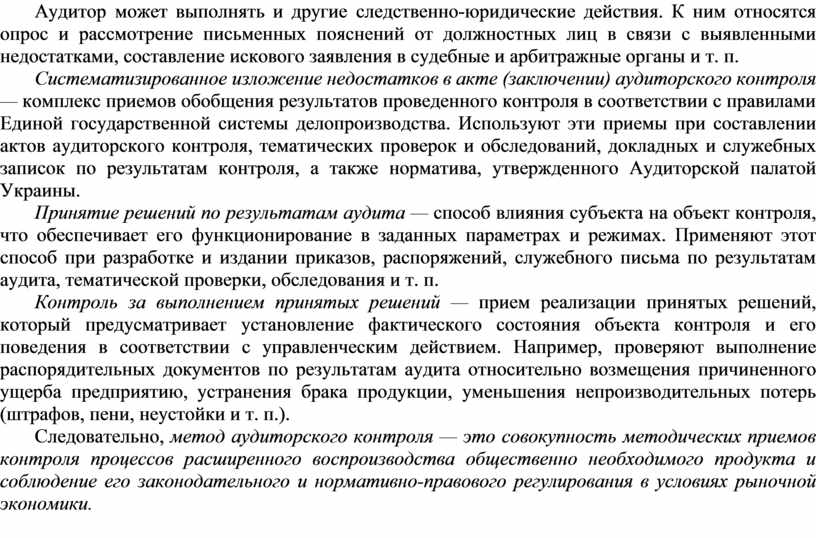 Аудитор может выполнять и другие следственно-юридические действия. К ним относятся опрос и рассмотрение письменных пояснений от должностных лиц в связи с выявленными недостатками, составление искового заявления в судебные и арбитражные органы и т. п.