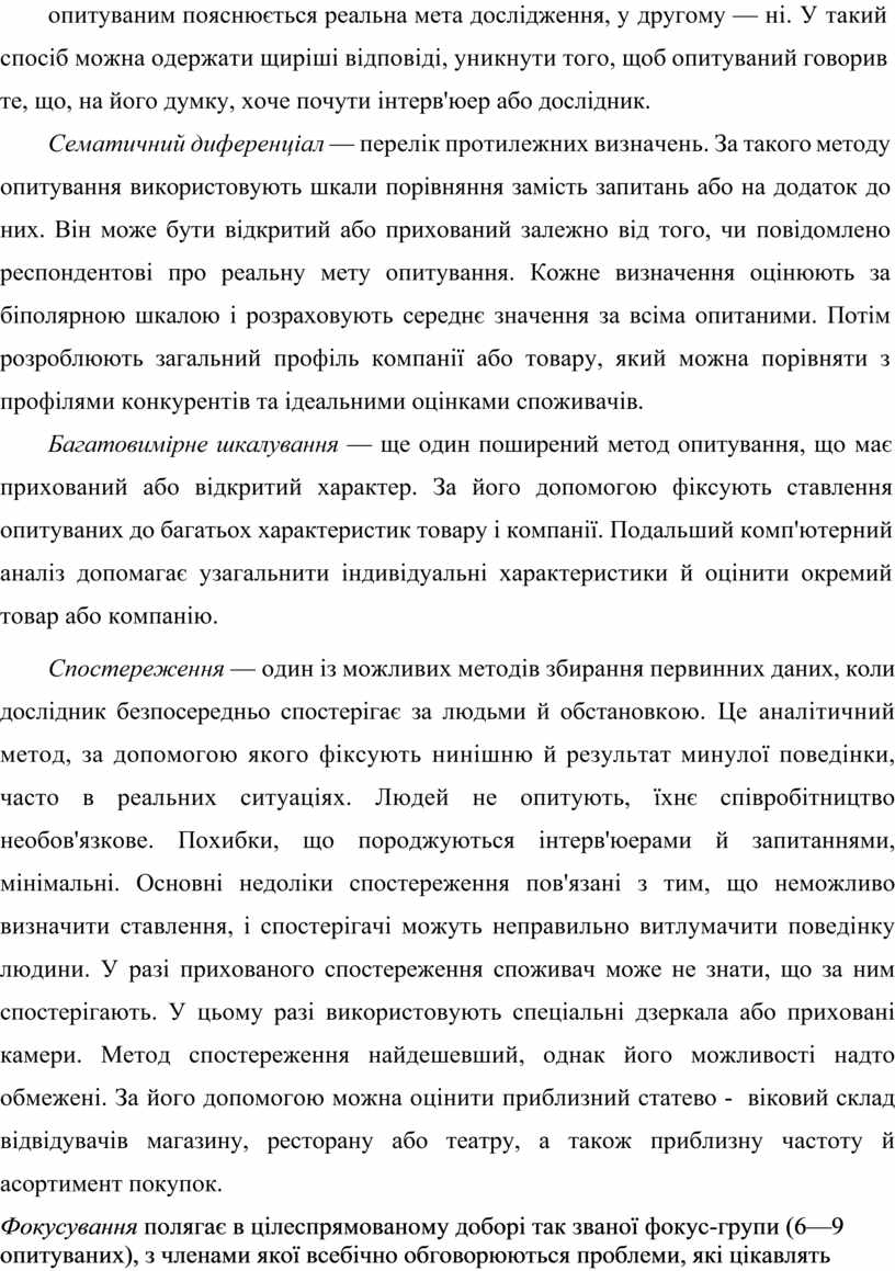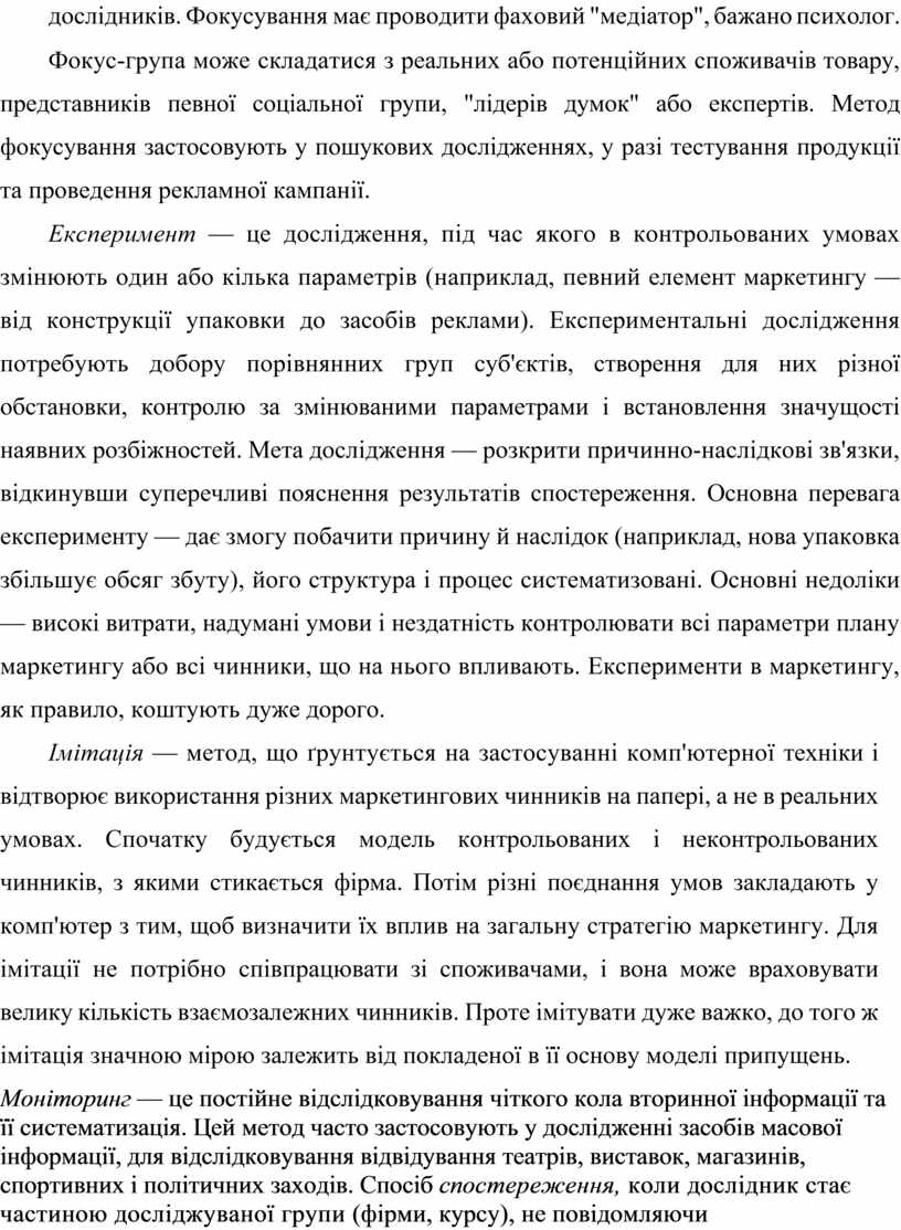 Існує багато методів збирання первинної та вторинної інформації. Первинну інформацію збирають за допомогою таких методів: опитування, спостереження, фокусування, експеримент, імітація. Під час опитування інформацію збирають, контактуючи з людьми особисто, телефоном або через листування. За допомогою цього методу можна довідатися про ставлення споживачів до фірми чи товару, отримати дані про минулі покупки й характеристику їх споживачів. Проте точність опитування залежить від щирості відповідей опитуваних. Усі відповіді заносять до анкети.