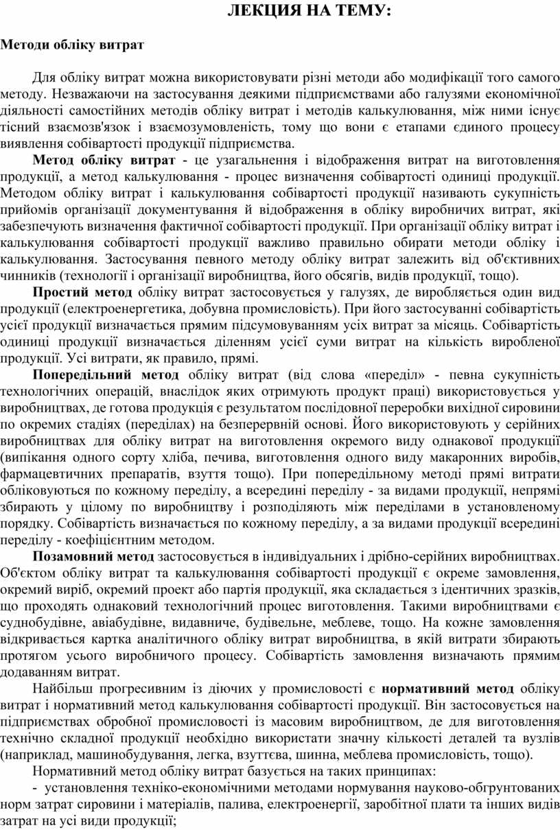 Найбільш прогресивним із діючих у промисловості є нормативний метод обліку витрат і нормативний метод калькулювання собівартості продукції. Він застосовується на підприємствах обробної промисловості із масовим виробництвом, де для виготовлення технічно складної продукції необхідно використати значну кількості деталей та вузлів (наприклад, машинобудування, легка, взуттєва, шинна, меблева промисловість, тощо).