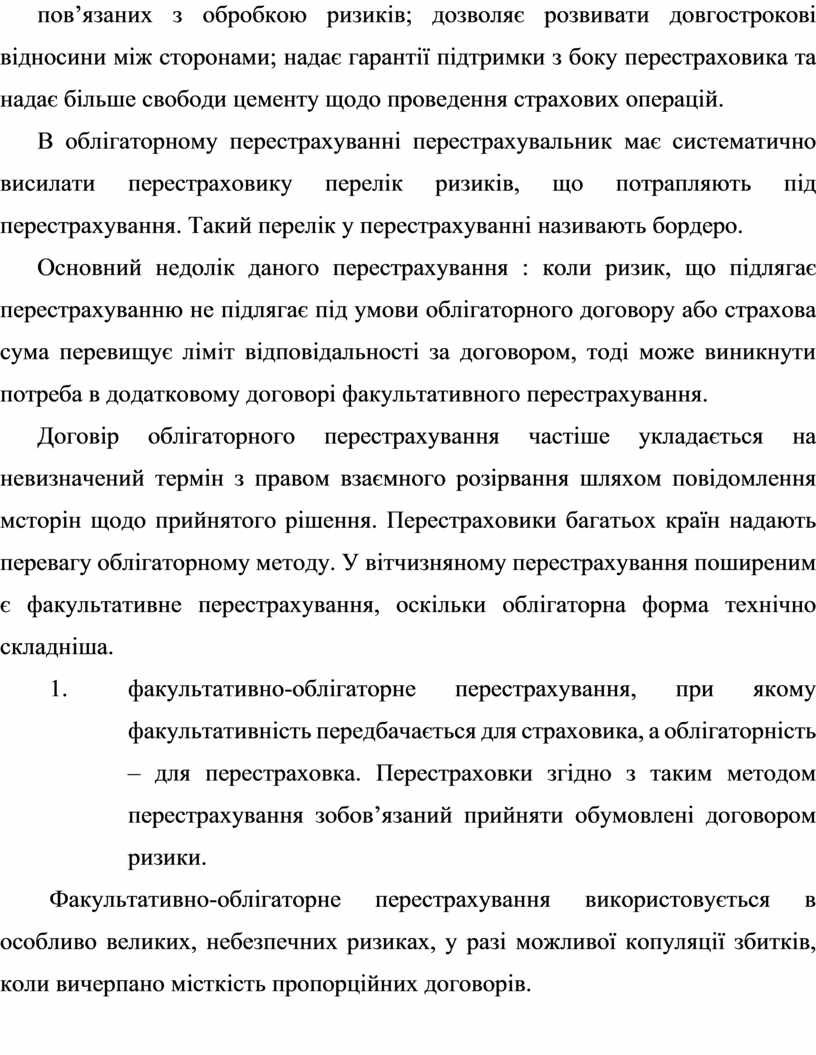 3. факультативно-облігаторне перестрахування, при якому факультативність передбачається для страховика, а облігаторність – для перестраховка. Перестраховки згідно з таким методом перестрахування зобов’язаний прийняти обумовлені договором ризики.