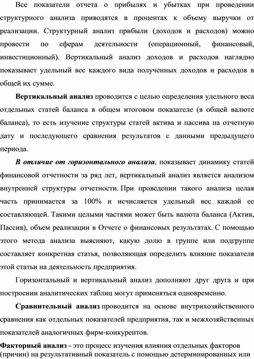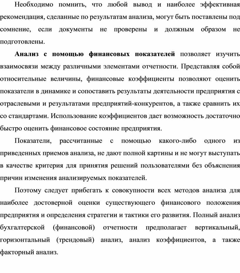 Поэтому следует прибегать к совокупности всех методов анализа для наиболее достоверной оценки существующего финансового положения предприятия и определения стратегии и тактики его развития. Полный анализ бухгалтерской (финансовой) отчетности предполагает вертикальный, горизонтальный (трендовый) анализ, анализ коэффициентов, а также факторный анализ.