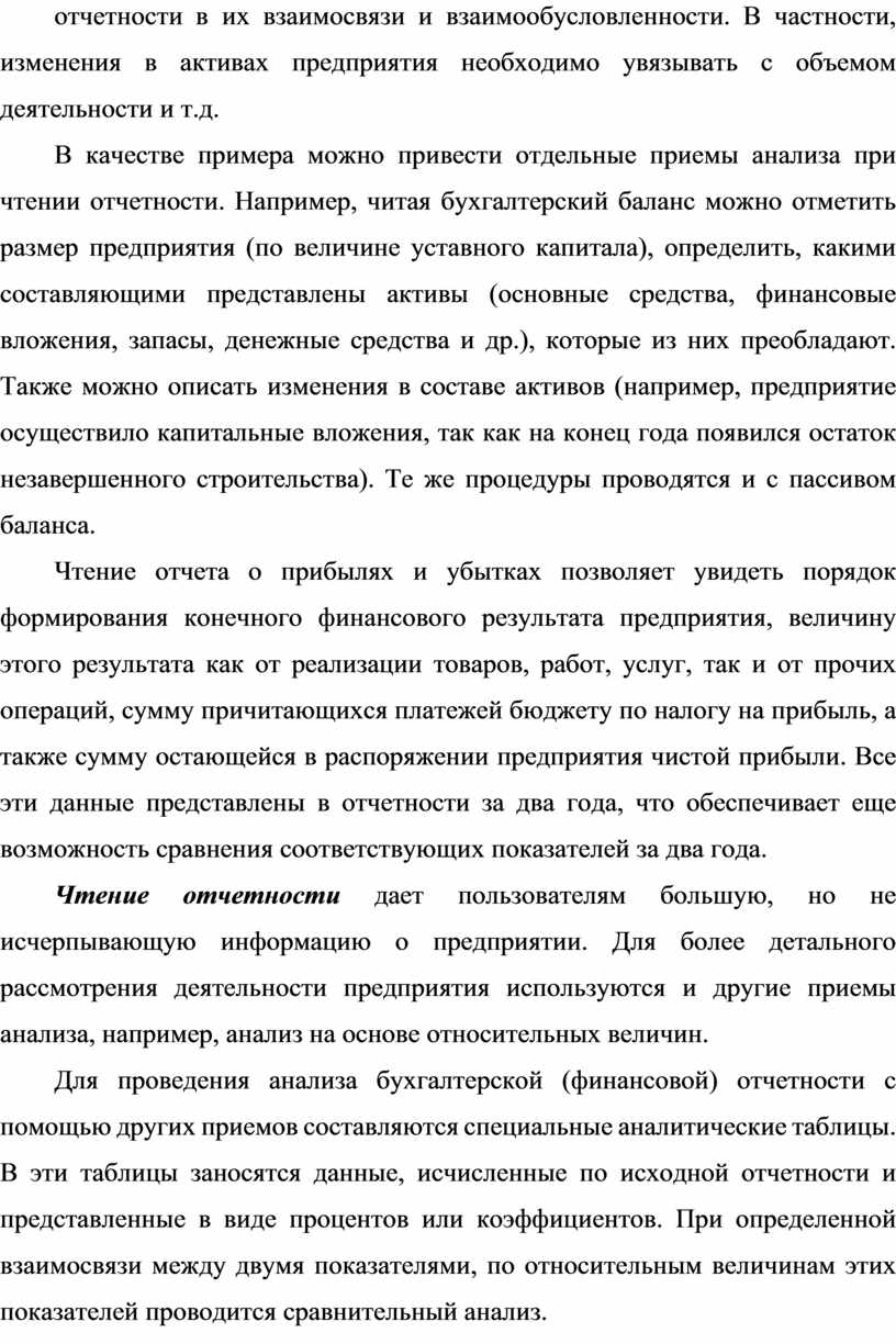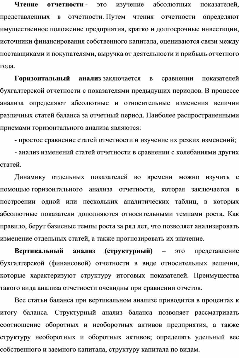 Чтение отчетности - это изучение абсолютных показателей, представленных в отчетности. Путем чтения отчетности определяют имущественное положение предприятия, кратко и долгосрочные инвестиции, источники финансирования собственного капитала, оцениваются связи между поставщиками и покупателями, выручка от деятельности и прибыль отчетного года.