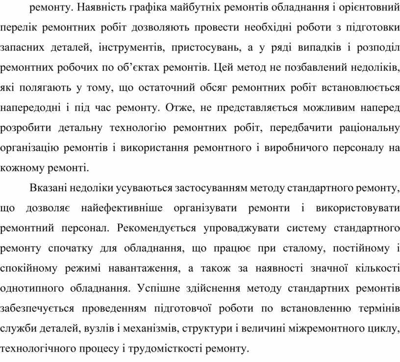 Вказані недоліки усуваються застосуванням методу стандартного ремонту, що дозволяє найефективніше організувати ремонти і використовувати ремонтний персонал. Рекомендується упроваджувати систему стандартного ремонту спочатку для обладнання, що працює при сталому, постійному і спокійному режимі навантаження, а також за наявності значної кількості однотипного обладнання. Успішне здійснення методу стандартних ремонтів забезпечується проведенням підготовчої роботи по встановленню термінів служби деталей, вузлів і механізмів, структури і величині міжремонтного циклу, технологічного процесу і трудомісткості ремонту.