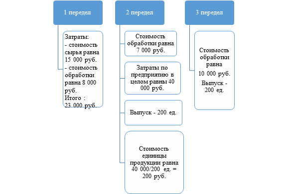 Себестоимость конечного продукта будет составлять сумму затрат всех переделов. Прямые затраты отражаются по каждому переделу в отдельности, а стоимость исходного сырья включается в себестоимость продукции только первого передела.
