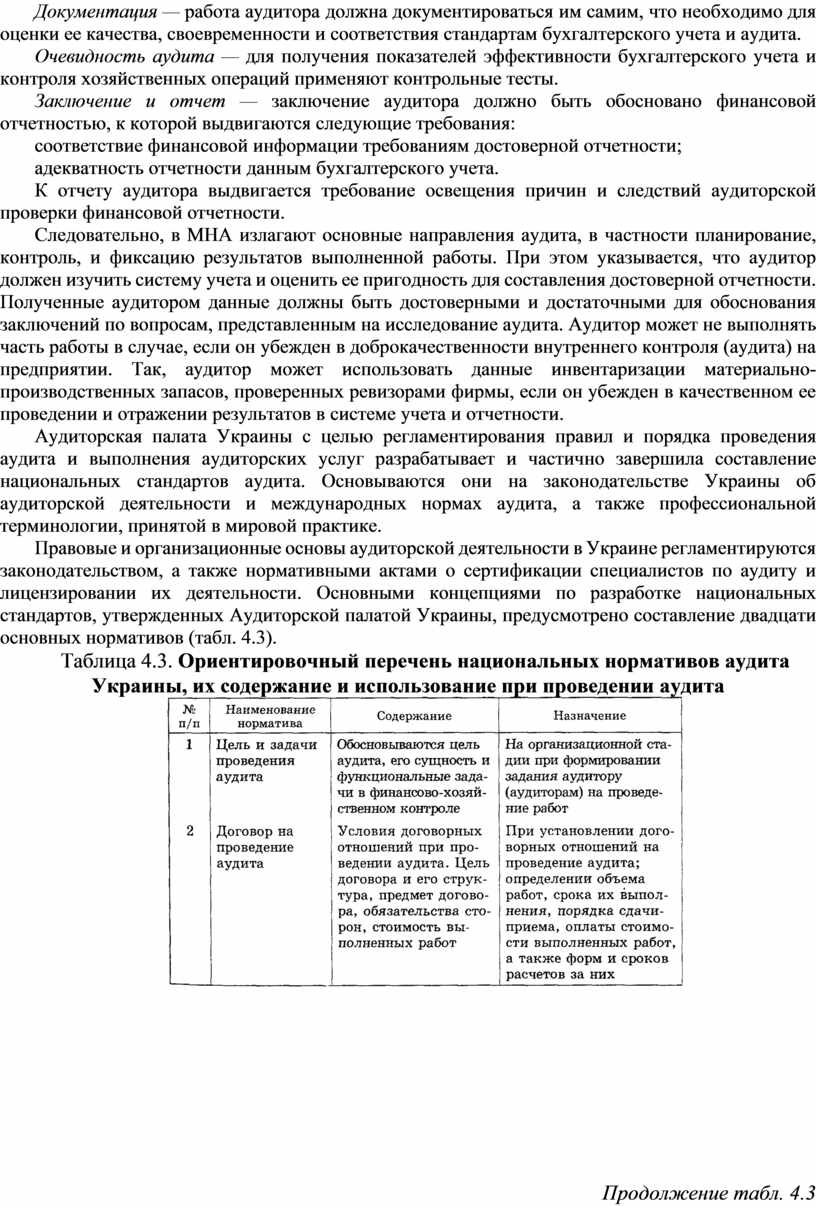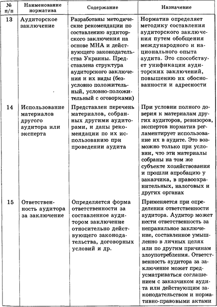 Из представленного ориентировочного перечня национальных норм аудита, их содержания и использования при проведении аудиторских работ видно, что они имеют определенное отличие от МНА, обусловленное законодательством Украины и действующими нормативными актами по вопросам бухгалтерского учета и отчетности, финансово-хозяйственного контроля и аудита. Значительная часть национальных норм аудита утверждена к применению Аудиторской палатой Украины, другие — на стадии завершения разработки и апробации. По структуре построения они соответствуют МНА, что способствует использованию зарубежного опыта в аудиторской деятельности.