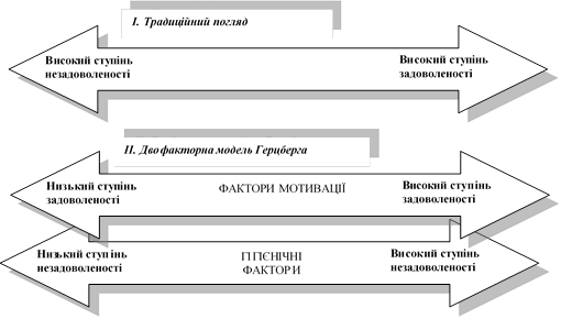 Наприкінці 50-х рр. XX ст. Фредерік Герцберг спільно зі своїми колегами провів дослідження щодо виявлення того, які фактори з тих, що здійснюють мотивуючий та демотивуючий вплив на поведінку людини, викликають її задоволеність або незадоволеність. Тобто дослідження Герцберга приводять до висновку, що задоволеність від роботи є двовимірним поняттям (на відміну від традиційного погляду – рис. 2).