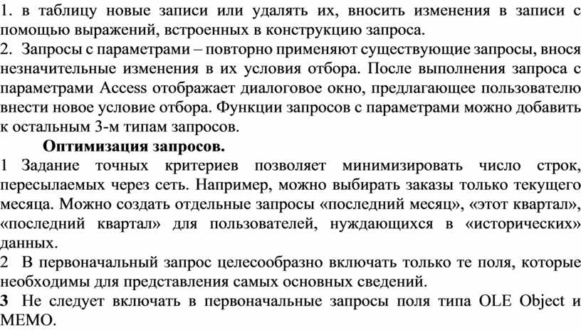 3 Не следует включать в первоначальные запросы поля типа OLE Object и MEMO.