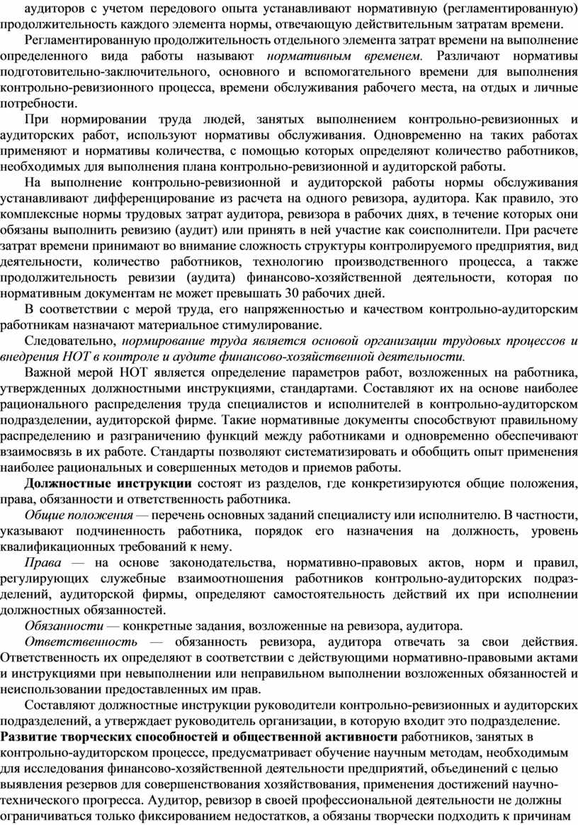 Нормирование и материальное стимулирование труда контрольно-аудиторских работников являются важными элементами планирования и внедрения НОТ. Организация использования рабочего времени ревизоров и аудиторов на научной основе, совмещение профессий, внедрение рациональной организации и образцового обслуживания рабочих мест, обучение их передовым приемам и методам труда обязательно сопровождаются установлением соответственных прогрессивных норм труда. И наоборот, технически обоснованные нормы требуют рациональной организации труда. Нормы, внедренные при рациональной организации труда, являются технически обоснованными и обязательными для применения при планировании аудиторской и контрольно-ревизионной работы.