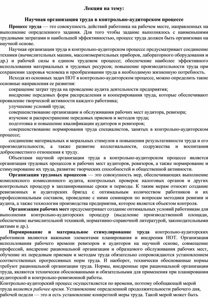 Научная организация труда в контрольно-аудиторском процессе предусматривает соединение техники (вычислительных машин, массоизмерительных приборов, лабораторного оборудования и др.) и рабочей силы в едином трудовом процессе; обеспечение наиболее эффективного использования материальных и трудовых ресурсов; повышение производительности труда при сохранении здоровья человека и преобразовании труда в необходимую жизненную потребность.