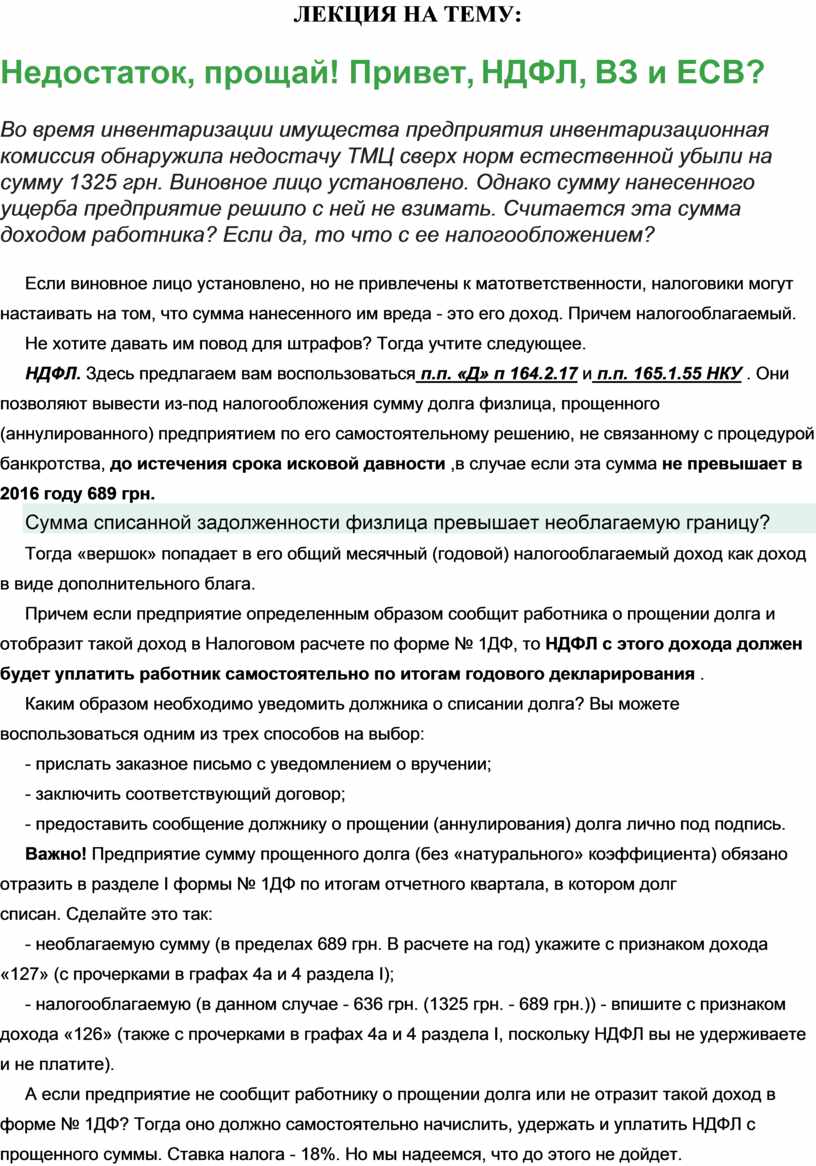 НДФЛ. Здесь предлагаем вам воспользоваться п.п. «Д» п 164.2.17 и п.п. 165.1.55 НКУ . Они позволяют вывести из-под налогообложения сумму долга физлица, прощенного (аннулированного) предприятием по его самостоятельному решению, не связанному с процедурой банкротства, до истечения срока исковой давности ,в случае если эта сумма не превышает в 2016 году 689 грн.