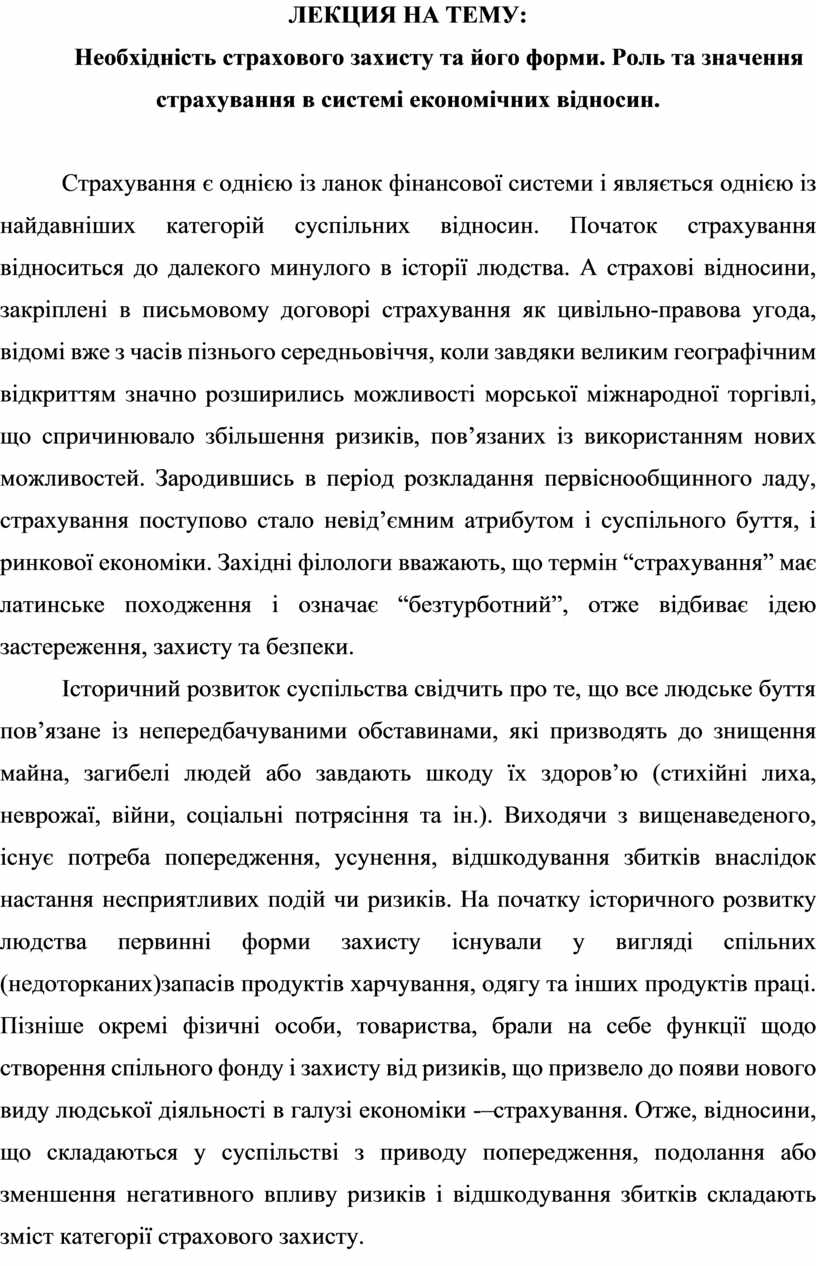 Страхування є однією із ланок фінансової системи і являється однією із найдавніших категорій суспільних відносин. Початок страхування відноситься до далекого минулого в історії людства. А страхові відносини, закріплені в письмовому договорі страхування як цивільно-правова угода, відомі вже з часів пізнього середньовіччя, коли завдяки великим географічним відкриттям значно розширились можливості морської міжнародної торгівлі, що спричинювало збільшення ризиків, пов’язаних із використанням нових можливостей. Зародившись в період розкладання первіснообщинного ладу, страхування поступово стало невід’ємним атрибутом і суспільного буття, і ринкової економіки. Західні філологи вважають, що термін “страхування” має латинське походження і означає “безтурботний”, отже відбиває ідею застереження, захисту та безпеки.