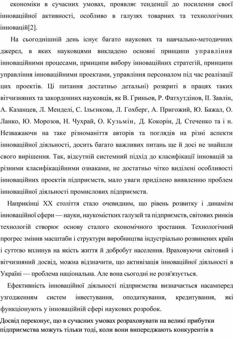 На сьогоднішній день існує багато наукових та навчально-методичних джерел, в яких науковцями викладено основні принципи управління інноваційними процесами, принципи вибору інноваційних стратегій, принципи управління інноваційними проектами, управління персоналом під час реалізації цих проектів. Ці питання достатньо детальні) розкриті в працях таких вітчизняних та закордонних науковців, як В. Гриньов, Р. Фатхутдінов, II. Завлін, А. Казанцев, Л. Менделі, С. Ільєнкова, Л. Гохберг, А. Пригожий, Ю. Бажал, О. Ланко, Ю. Морозов, Н. Чухрай, О. Кузьмін, Д. Кокорін, Д. Стеченко та і н. Незважаючи на таке різноманіття авторів та поглядів на різні аспекти інноваційної діяльності, досить багато важливих питань ще й досі не знайшли свого вирішення. Так, відсутній системний підхід до класифікації інновацій за різними класифікаційними ознаками, не достатньо чітко виділені особливості інноваційних проектів підприємств, мало уваги приділено виявленню проблем інноваційної діяльності промислових підприємств.