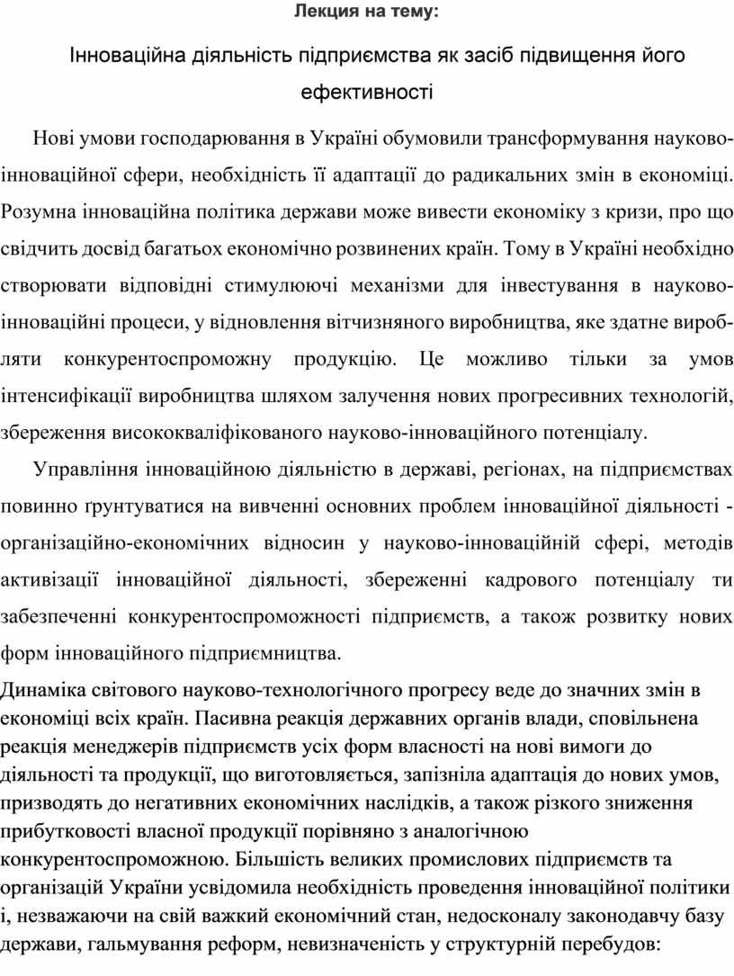 Динаміка світового науково-технологічного прогресу веде до значних змін в економіці всіх країн. Пасивна реакція державних органів влади, сповільнена реакція менеджерів підприємств усіх форм власності на нові вимоги до діяльності та продукції, що виготовляється, запізніла адаптація до нових умов, призводять до негативних економічних наслідків, а також різкого зниження прибутковості власної продукції порівняно з аналогічною конкурентоспроможною. Більшість великих промислових підприємств та організацій України усвідомила необхідність проведення інноваційної політики і, незважаючи на свій важкий економічний стан, недосконалу законодавчу базу держави, гальмування реформ, невизначеність у структурній перебудов: економіки в сучасних умовах, проявляє тенденції до посилення своєї інноваційної активності, особливо в галузях товарних та технологічних інновацій[2].