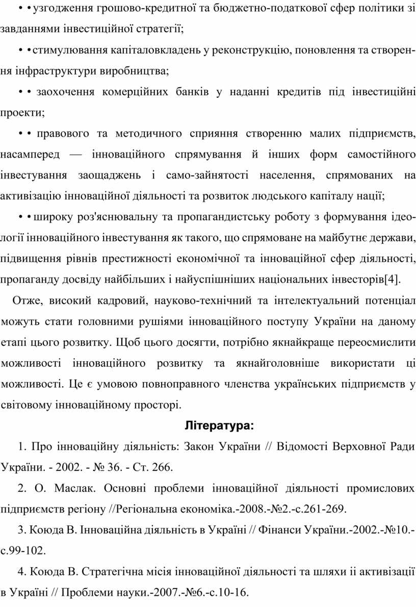 3. Коюда В. Інноваційна діяльність в Україні // Фінанси України.-2002.-№10.-с.99-102.