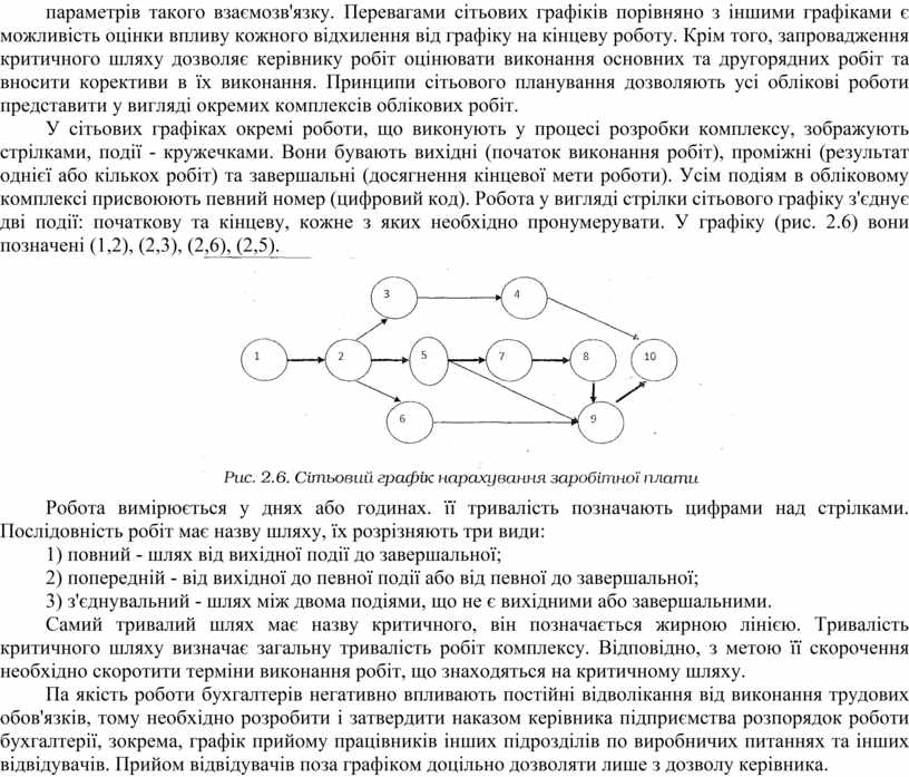 У сітьових графіках окремі роботи, що виконують у процесі розробки комплексу, зображують стрілками, події - кружечками. Вони бувають вихідні (початок виконання робіт), проміжні (результат однієї або кількох робіт) та завершальні (досягнення кінцевої мети роботи). Усім подіям в обліковому комплексі присвоюють певний номер (цифровий код). Робота у вигляді стрілки сітьового графіку з'єднує дві події: початкову та кінцеву, кожне з яких необхідно пронумерувати. У графіку (рис. 2.6) вони позначені (1,2), (2,3), (2,6), (2,5).