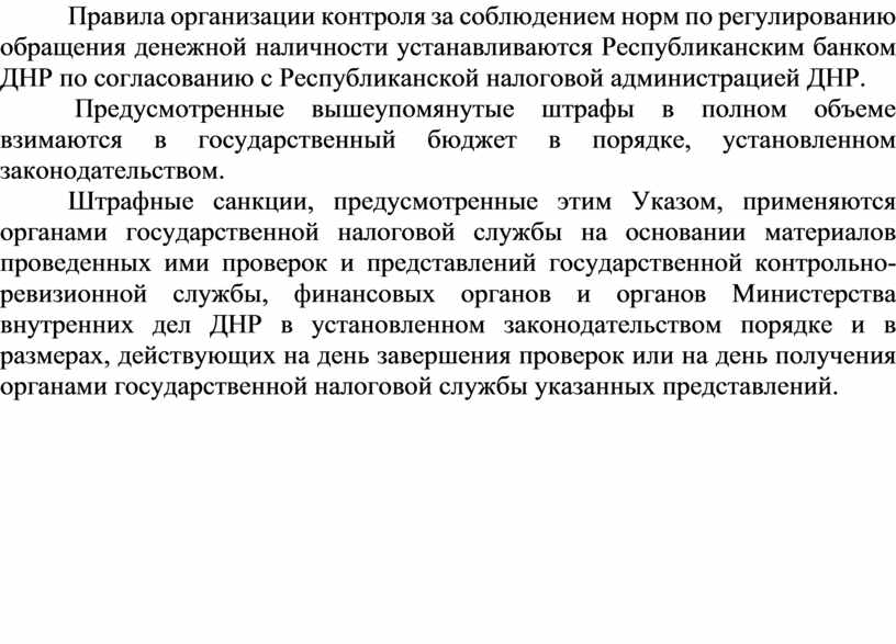 Правила организации контроля за соблюдением норм по регулированию обращения денежной наличности устанавливаются Республиканским банком ДНР по согласованию с Республиканской налоговой администрацией ДНР.