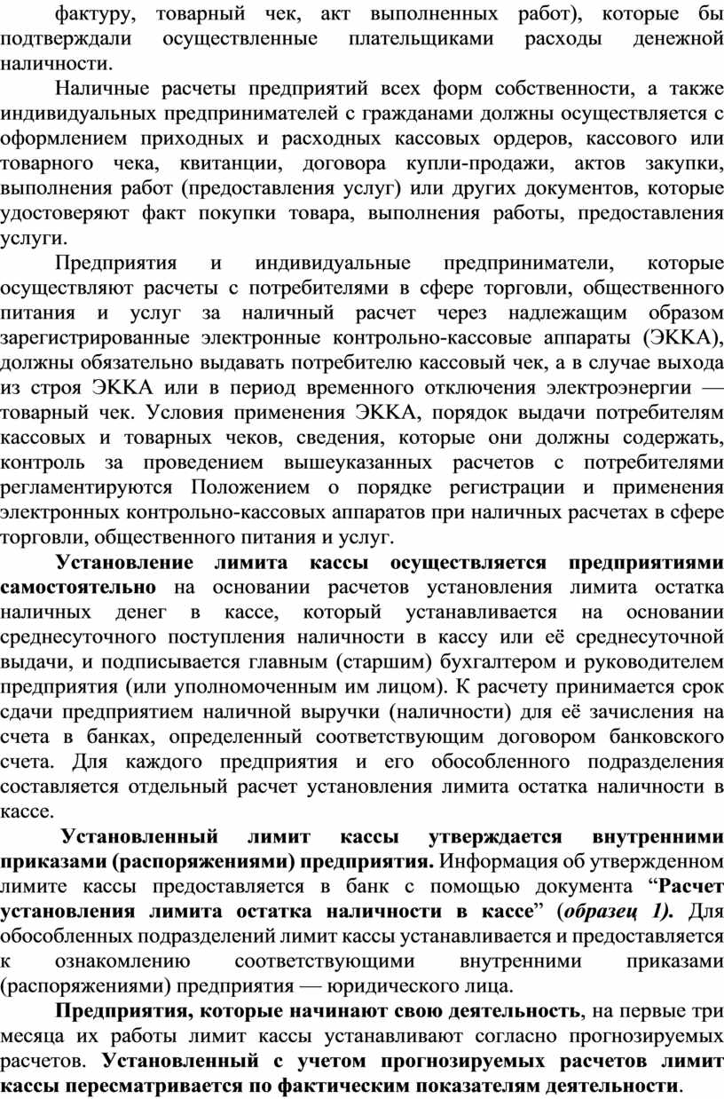 В случае осуществления предприятиями наличных расчетов с другими предприятиями (предпринимателями) свыше установленной предельной суммы, средства в размере превышения установленной суммы прибавляются к фактическим остаткам денежной наличности в кассе на конец дня с дальнейшим сравнением полученной расчетной суммы с утвержденным лимитом кассы.