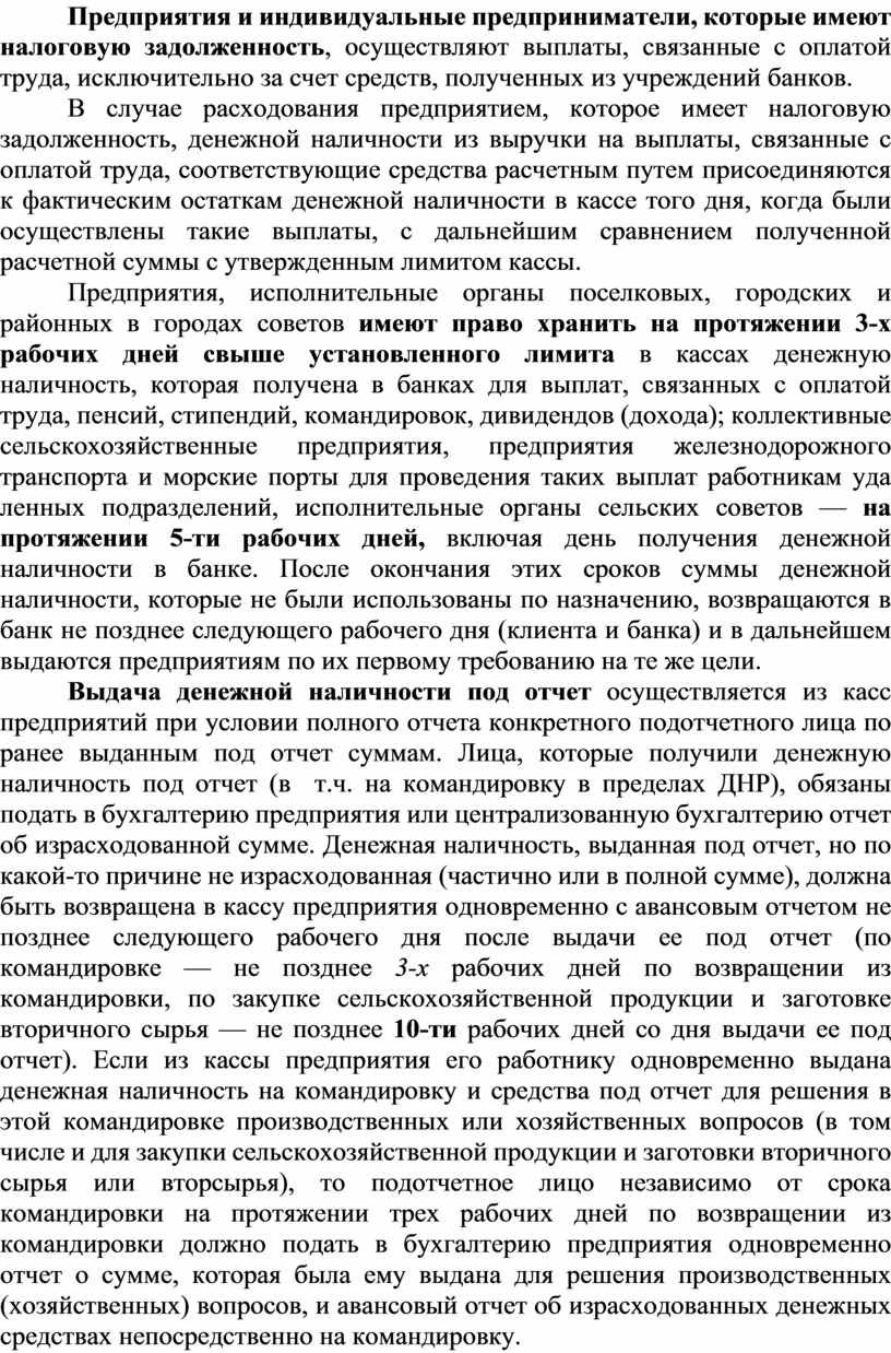 Выдача денежной наличности под отчет осуществляется из касс предприятий при условии полного отчета конкретного подотчетного лица по ранее выданным под отчет суммам. Лица, которые получили денежную наличность под отчет (в т.ч. на командировку в пределах ДНР), обязаны подать в бухгалтерию предприятия или централизованную бухгалтерию отчет об израсходованной сумме. Денежная наличность, выданная под отчет, но по какой-то причине не израсходованная (частично или в полной сумме), должна быть возвращена в кассу предприятия одновременно с авансовым отчетом не позднее следующего рабочего дня после выдачи ее под отчет (по командировке — не позднее 3-х рабочих дней по возвращении из командировки, по закупке сельскохозяйственной продукции и заготовке вторичного сырья — не позднее 10-ти рабочих дней со дня выдачи ее под отчет). Если из кассы предприятия его работнику одновременно выдана денежная наличность на командировку и средства под отчет для решения в этой командировке производственных или хозяйственных вопросов (в том числе и для закупки сельскохозяйственной продукции и заготовки вторичного сырья или вторсырья), то подотчетное лицо независимо от срока командировки на протяжении трех рабочих дней по возвращении из командировки должно подать в бухгалтерию предприятия одновременно отчет о сумме, которая была ему выдана для решения производственных (хозяйственных) вопросов, и авансовый отчет об израсходованных денежных средствах непосредственно на командировку.