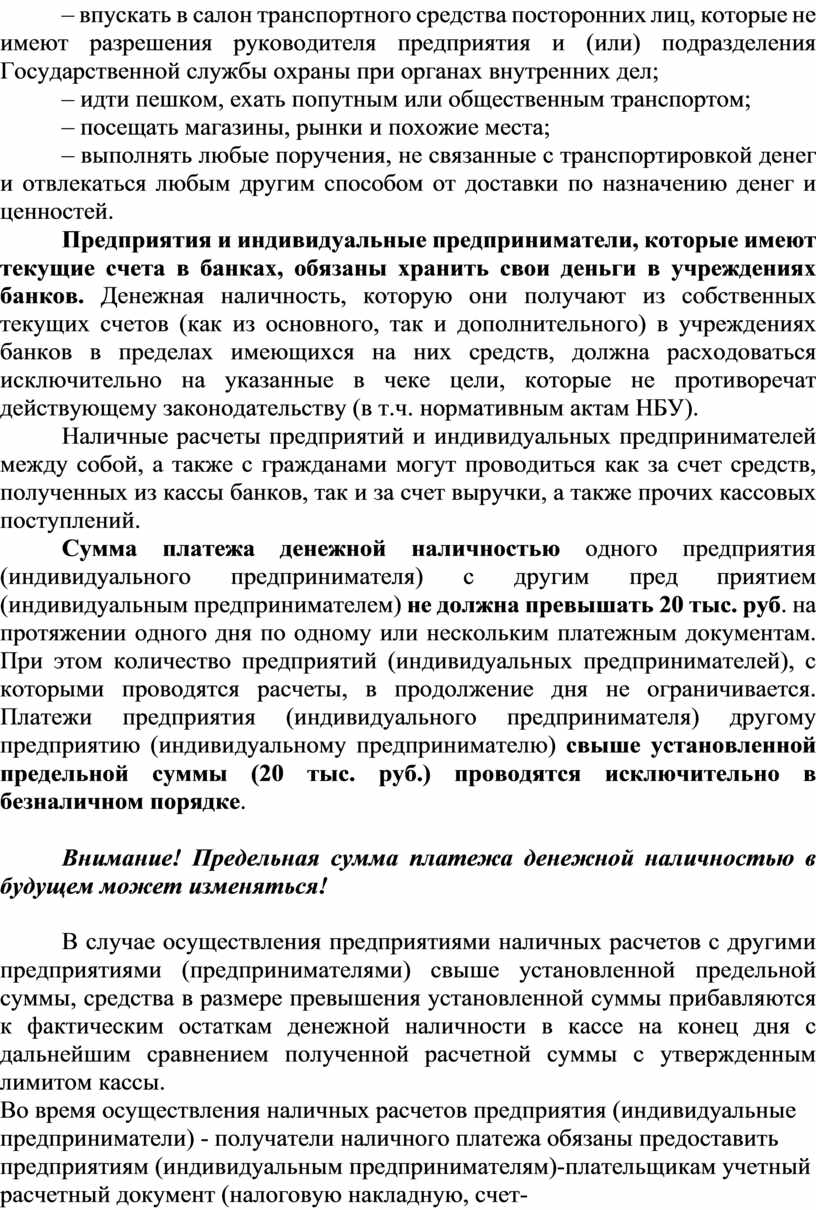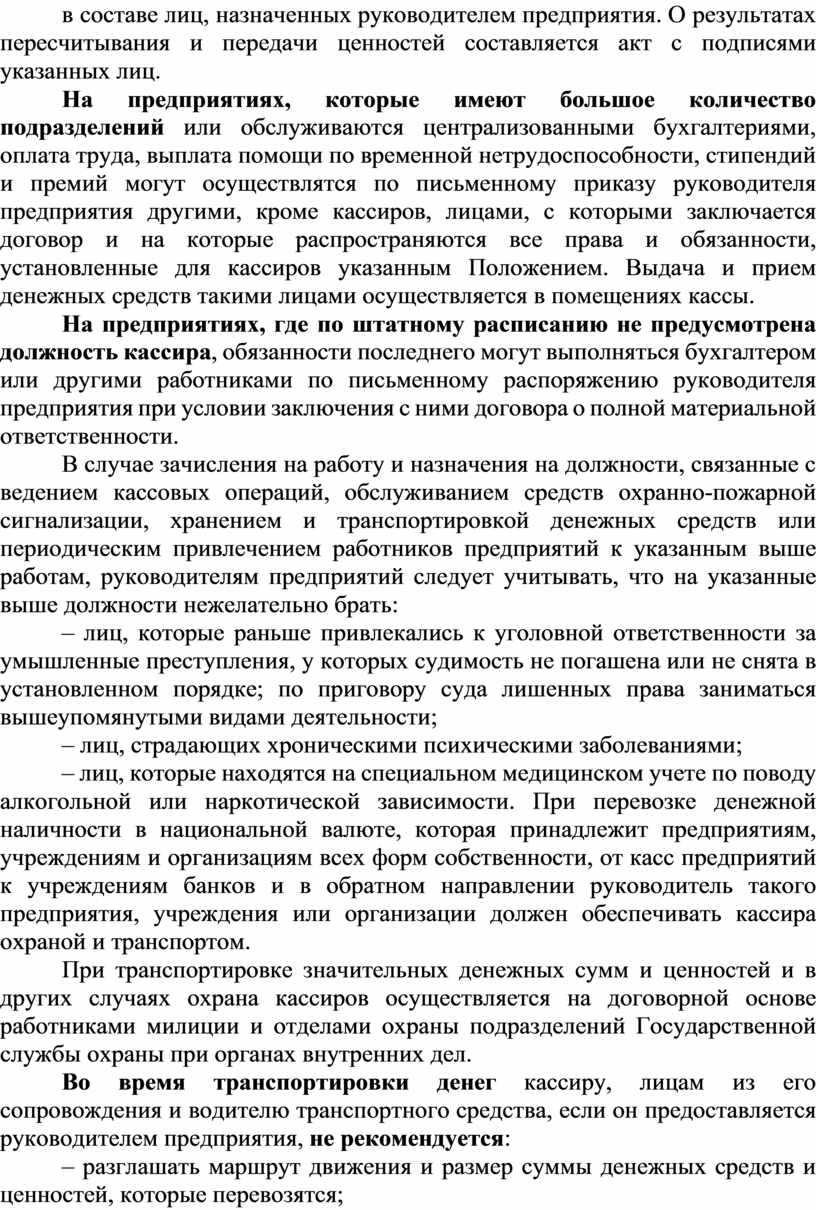 – лиц, которые находятся на специальном медицинском учете по поводу алкогольной или наркотической зависимости. При перевозке денежной наличности в национальной валюте, которая принадлежит предприятиям, учреждениям и организациям всех форм собственности, от касс предприятий к учреждениям банков и в обратном направлении руководитель такого предприятия, учреждения или организации должен обеспечивать кассира охраной и транспортом.