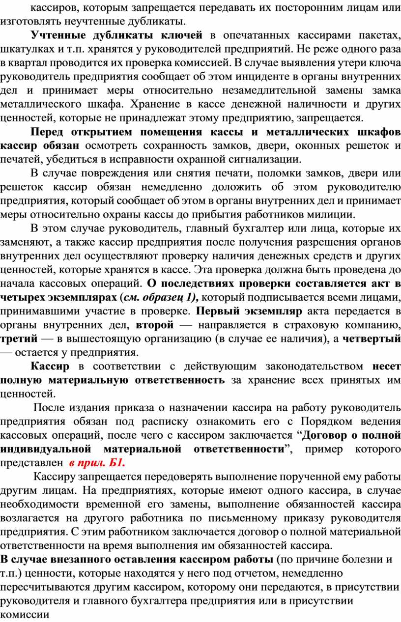 После издания приказа о назначении кассира на работу руководитель предприятия обязан под расписку ознакомить его с Порядком ведения кассовых операций, после чего с кассиром заключается “Договор о полной индивидуальной материальной ответственности”, пример которого представлен в прил. Б1.