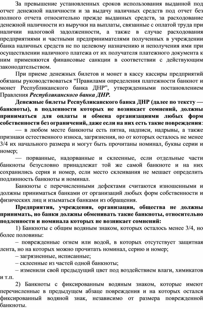 При приеме денежных билетов и монет в кассу кассиры предприятий обязаны руководствоваться “Правилами определения платежности банкнот и монет Республиканского банка ДНР”, утвержденными постановлением Правления Республиканского банка ДНР.