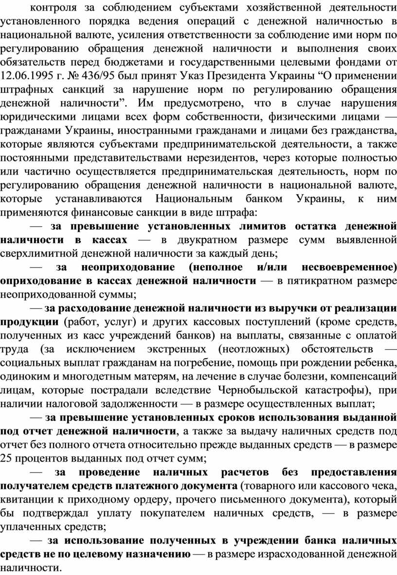 В целях дальнейшего усовершенствования организации наличного обращения, укрепления кассовой дисциплины, повышения эффективности контроля за соблюдением субъектами хозяйственной деятельности установленного порядка ведения операций с денежной наличностью в национальной валюте, усиления ответственности за соблюдение ими норм по регулированию обращения денежной наличности и выполнения своих обязательств перед бюджетами и государственными целевыми фондами от 12.06.1995 г. № 436/95 был принят Указ Президента Украины “О применении штрафных санкций за нарушение норм по регулированию обращения денежной наличности”. Им предусмотрено, что в случае нарушения юридическими лицами всех форм собственности, физическими лицами — гражданами Украины, иностранными гражданами и лицами без гражданства, которые являются субъектами предпринимательской деятельности, а также постоянными представительствами нерезидентов, через которые полностью или частично осуществляется предпринимательская деятельность, норм по регулированию обращения денежной наличности в национальной валюте, которые устанавливаются Национальным банком Украины, к ним применяются финансовые санкции в виде штрафа: