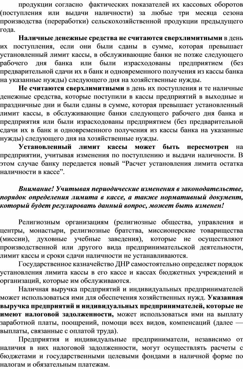 Государственное казначейство ДНР самостоятельно определяет порядок установления лимита кассы в его кассе и кассах бюджетных учреждений и организаций, которые им обслуживаются.