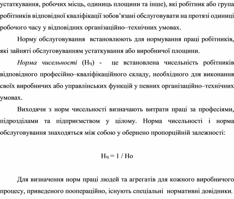 Норма обслуговування (Но) - це кількість виробничих об’єктів (одиниць устаткування, робочих місць, одиниць площини та інше), які робітник або група робітників відповідної кваліфікації зобов’язані обслуговувати на протязі одиниці робочого часу у відповідних організаційно–технічних умовах.