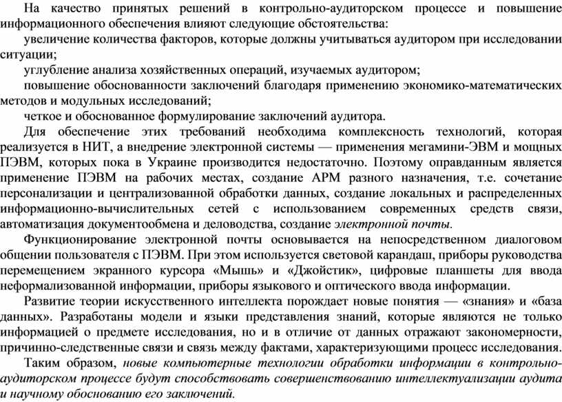 Таким образом, новые компьютерные технологии обработки информации в контрольно-аудиторском процессе будут способствовать совершенствованию интеллектуализации аудита и научному обоснованию его заключений.