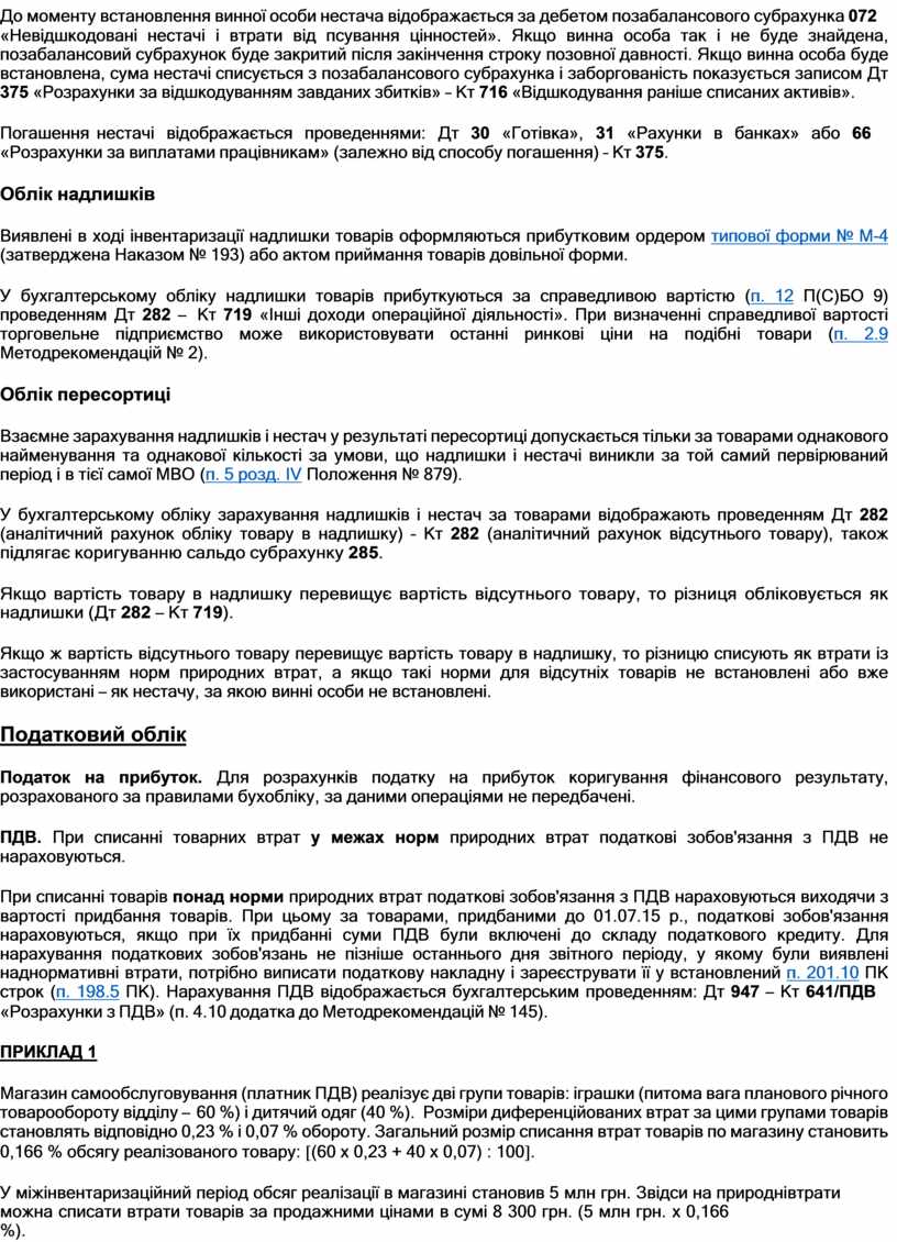 Якщо ж вартість відсутнього товару перевищує вартість товару в надлишку, то різницю списують як втрати із застосуванням норм природних втрат, а якщо такі норми для відсутніх товарів не встановлені або вже використані – як нестачу, за якою винні особи не встановлені.