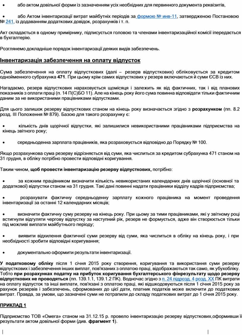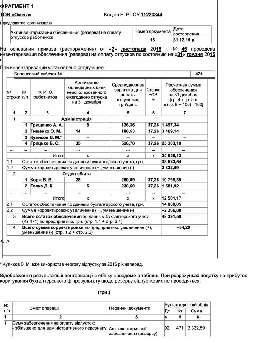 Підприємство ТОВ «Омега» станом на 31.12.15 р. провело інвентаризацію резерву відпусткових, оформивши її результати актом довільної форми (див. фрагмент 1).