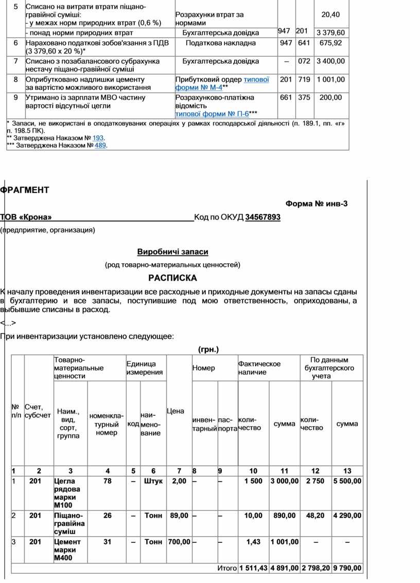 У ході інвентаризації інвентаризаційна комісія ТОВ «Крона» виявила: