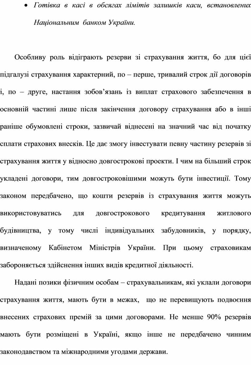 Особливу роль відіграють резерви зі страхування життя, бо для цієї підгалузі страхування характерний, по – перше, тривалий строк дії договорів і, по – друге, настання зобов’язань із виплат страхового забезпечення в основній частині лише після закінчення договору страхування або в інші раніше обумовлені строки, зазвичай віднесені на значний час від початку сплати страхових внесків. Це дає змогу інвестувати певну частину резервів зі страхування життя у відносно довгострокові проекти. І чим на більший строк укладені договори, тим довгостроковішими можуть бути інвестиції. Тому законом передбачено, що кошти резервів із страхування життя можуть використовуватись для довгострокового кредитування житлового будівництва, у тому числі індивідуальних забудовників, у порядку, визначеному Кабінетом Міністрів України. При цьому страховикам забороняється здійснення інших видів кредитної діяльності.
