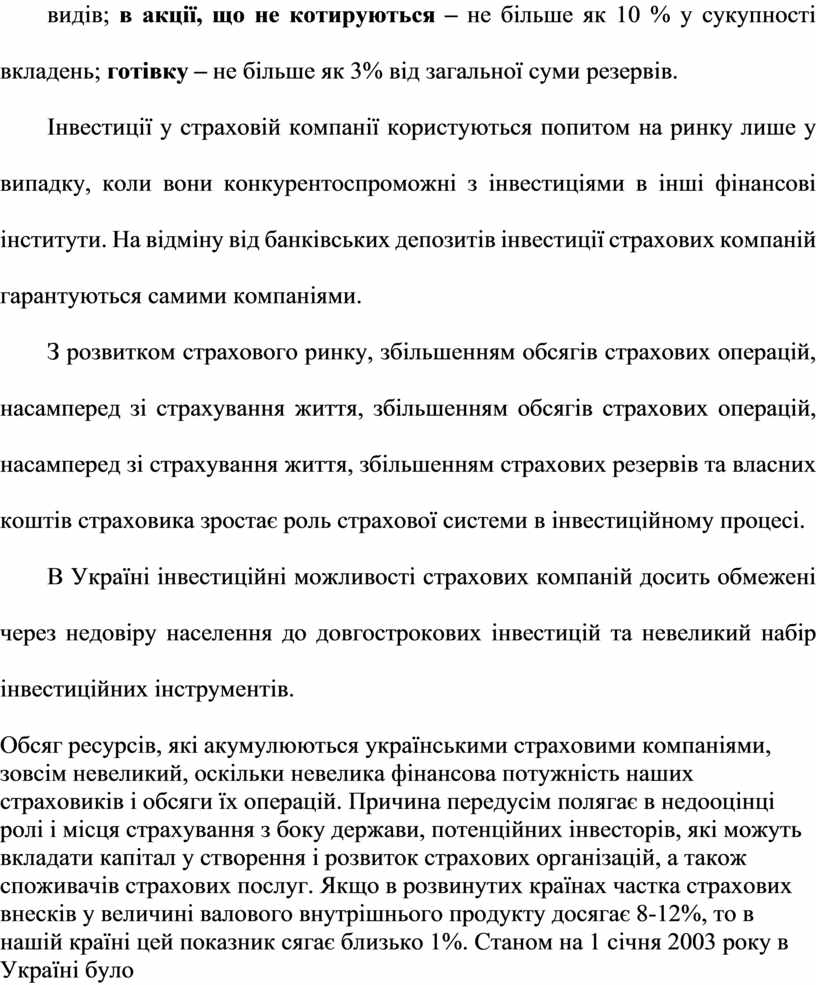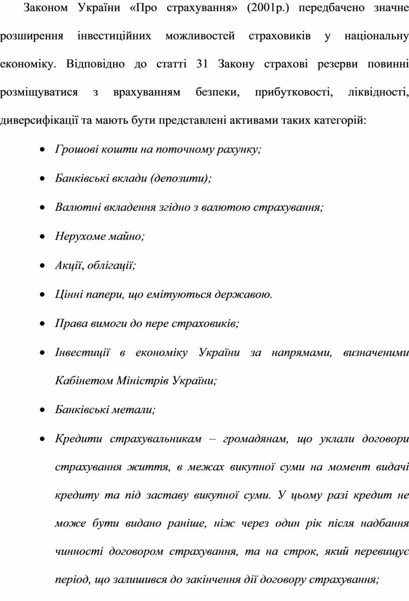 Законом України «Про страхування» (2001р.) передбачено значне розширення інвестиційних можливостей страховиків у національну економіку. Відповідно до статті 31 Закону страхові резерви повинні розміщуватися з врахуванням безпеки, прибутковості, ліквідності, диверсифікації та мають бути представлені активами таких категорій: