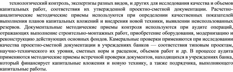 Особенность методических приемов аудита, обобщения и реализации его результатов состоит в применении таких органолептических приемов, как инвентаризация, контрольные замеры, технологический контроль, экспертизы разных видов, и других для исследования качества и объемов капитальных работ, соответствия их утвержденной проектно-сметной документации. Расчетно-аналитические методические приемы используются при определении качественных показателей выполнения планов капитальных вложений и внедрения новой техники, выявлении неиспользованных резервов. Документальные методические приемы контроля используются при аудите операций, отражающих выполнение строительно-монтажных работ, приобретение оборудования, модернизацию и реконструкцию действующих основных фондов. Камеральные проверки применяются при исследовании качества проектно-сметной документации в учреждениях банков — соответствия типовым проектам, научно-технического их уровня, сметных норм и расценок, объемов работ и др. В процессе аудита применяются методические приемы встречной проверки документов, находящихся в учреждениях банка, который финансирует капитальные вложения и новую технику, а также подрядчика, выполняющего капитальные работы.