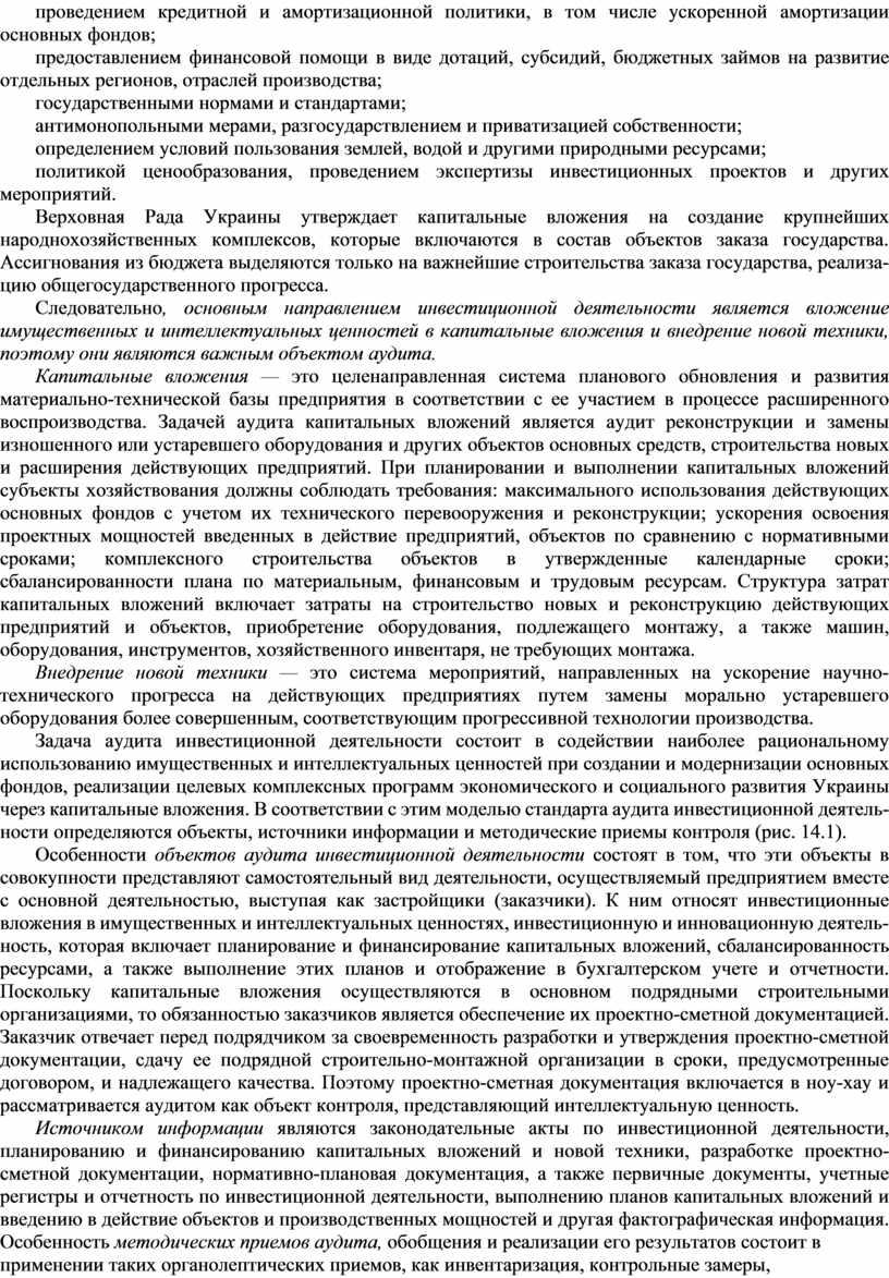 Задача аудита инвестиционной деятельности состоит в содействии наиболее рациональному использованию имущественных и интеллектуальных ценностей при создании и модернизации основных фондов, реализации целевых комплексных программ экономического и социального развития Украины через капитальные вложения. В соответствии с этим моделью стандарта аудита инвестиционной деятельности определяются объекты, источники информации и методические приемы контроля (рис. 14.1).