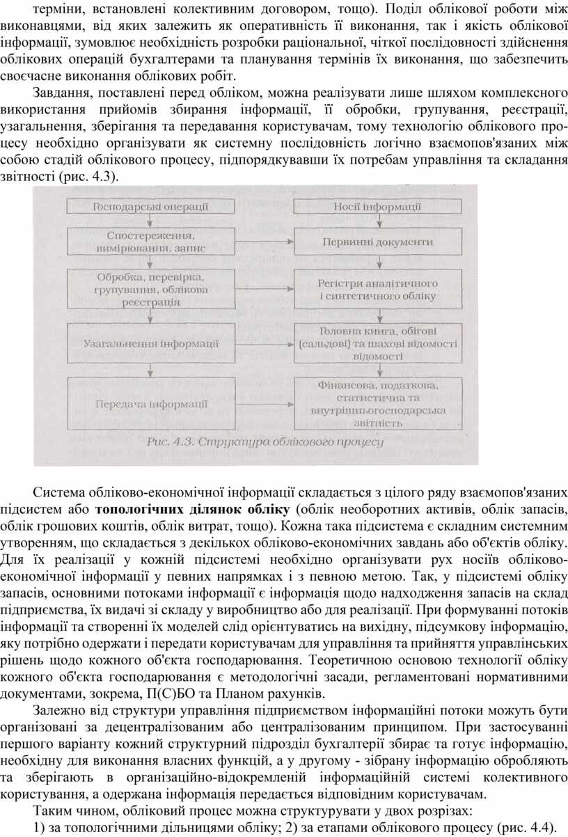 Завдання, поставлені перед обліком, можна реалізувати лише шляхом комплексного використання прийомів збирання інформації, її обробки, групування, реєстрації, узагальнення, зберігання та передавання користувачам, тому технологію облікового процесу необхідно організувати як системну послідовність логічно взаємопов'язаних між собою стадій облікового процесу, підпорядкувавши їх потребам управління та складання звітності (рис. 4.3).