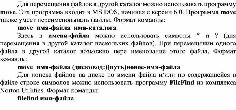 Для перемещения файлов в другой каталог можно использовать программу move. Эта программа входит в MS DOS, начиная с версии 6.0. Программа move также умеет переименовывать файлы. Формат команды: